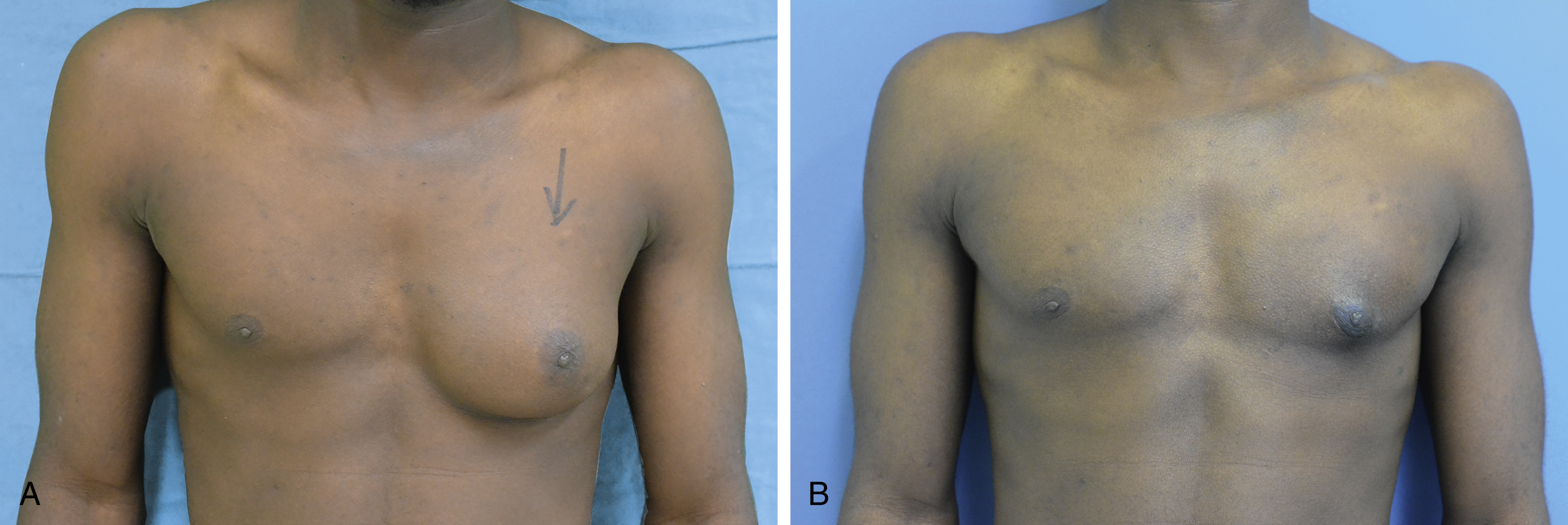 Management consists of excising the breast tissue and removing excess skin, if present. A semicircular periareolar incision is commonly used for breast tissue excision. Liposuction (traditional suction-assisted or ultrasonic-assisted) is used to remove the surrounding stromal hypertrophy or fibrofatty accumulation around the breast. The breast bud is often too firm and liposuction alone is difficult, however it could be used to fragment the breast tissue, facilitating subsequent excision through a limited excision (pull-through technique). , Arthroscopic shavers have been used to remove the firm fibrous breast tissue, obviating the need for a periareolar incision in certain cases. Mild skin excess may resolve after gland excision due to skin contraction. In view of the capacity for contraction of the skin envelope with the exception of dramatic skin excess, a staged approach may be considered with volume reduction as an initial treatment, followed by revision surgery if necessary 6–12 months later. When skin resection is necessary, an algorithm similar to that implemented for mastopexy may be applied. In cases of significant skin excess, a circumareolar, circumvertical, or wise-pattern skin resection can be considered depending on the severity.