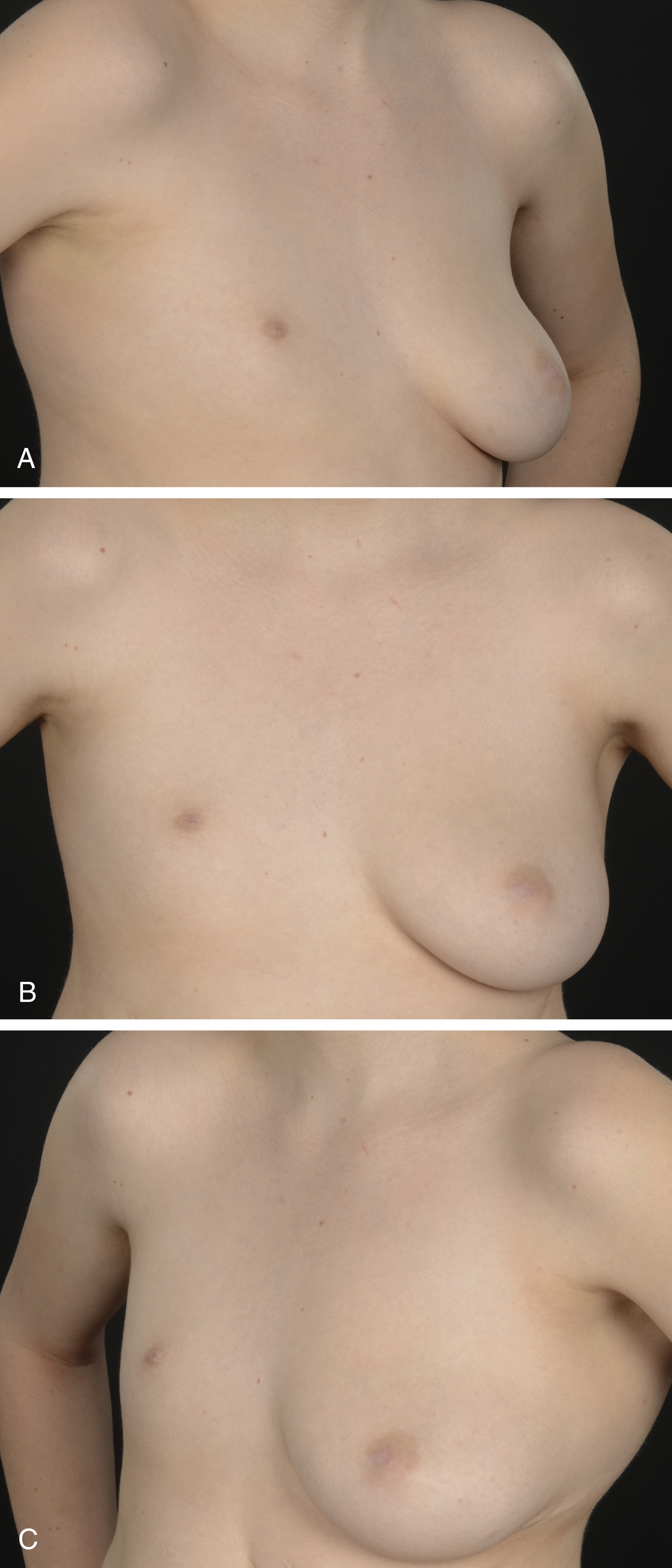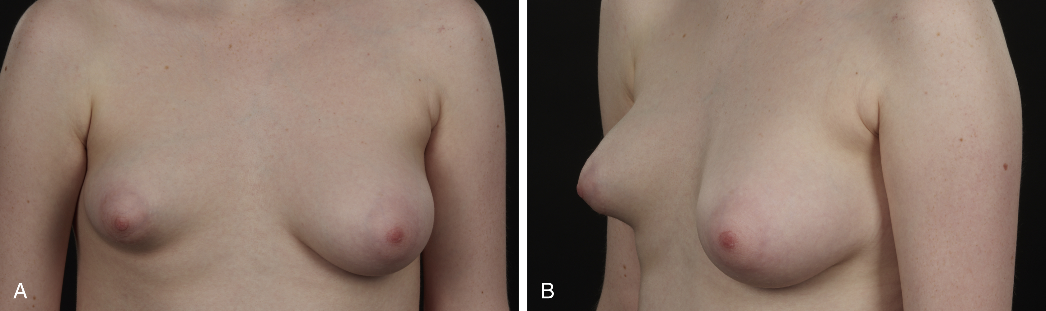 The absence of nipple (athelia) and/or glandular breast tissue (amastia/amazia, respectively) is a rare occurrence. According to Lin and Nguyen, there are different presentations of amastia and each can be attributed to different underlying pathologies: (1) ectodermal defects may cause bilateral absence of breasts in males and females and is related to failure of development of the ectodermal layer and its appendages (abnormalities of the skin, teeth and nails); (2) bilateral amastia may be an isolated occurrence or be associated with other anomalies of the palate and upper extremities; (3) unilateral amastia may be a variant of Poland syndrome and should be treated accordingly ( Fig. 37.3 ). Treatment of amastia and athelia may follow the principles of post-oncologic breast reconstruction with special attention paid to the placement of the inframammary fold and nipple. However, reconstruction in patients with amastia should be performed keeping in mind potential aberrations of the blood supply to the skin. Very often, reconstruction for amastia is initiated prior to physical maturity with placement of a tissue expander, which is inflated commensurate with the growth of the normal contralateral breast or in bilateral cases, initiated at thelarche and continued proportionate with body habitus.
