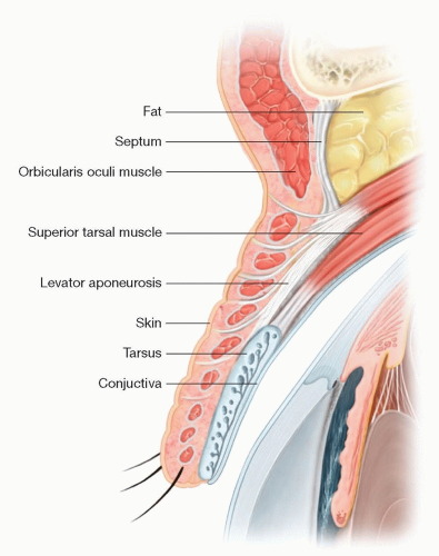 In patients not of Asian descent, the lid crease is located between the upper border of the tarsus and the insertion of the orbital septum, which is approximately 3 to 5 mm superior to the upper border of the tarsus. The lid crease is approximately 9 to 11 mm and 8 to 9 mm superior to the eyelid margin in females and males, respectively.