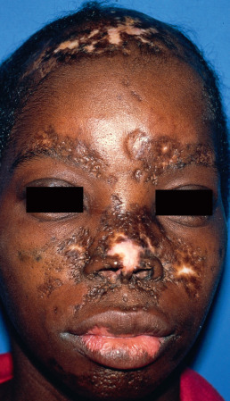 Discoid lupus erythematosus (DLE) generally occurs in young adults, with women outnumbering men 2 : 1. Lesions begin as dull-red macules or indurated plaques that develop an adherent scale, then evolve with atrophy, scarring, and pigment changes ( Fig. 8.1 ). In darker-skinned individuals, lesions typically demonstrate areas of both hyperpigmentation and depigmentation. In lighter-skinned patients, the plaques may appear gray or have minimal pigment alteration. The hyperkeratosis characteristically extends into patulous follicles, producing carpet tacklike spines on the undersurface of the scale.