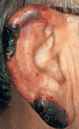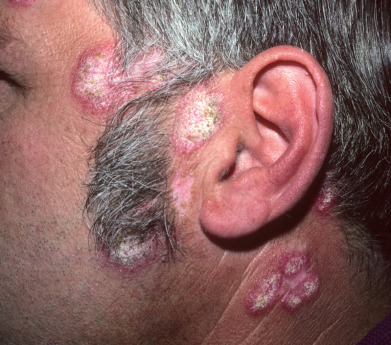 Discoid lesions are usually localized above the neck, particularly on sun-exposed sites such as the scalp, bridge of the nose, malar areas, lower lip, and ears ( Fig. 8.2 ). The concha of the ear and external canal are frequently involved. Typical lesions are disk-shaped areas of erythema, with follicular plugging, which progress to develop atrophy, scarring, and pigment alteration. Some patients present with periorbital edema and erythema. On the scalp, most lesions begin as erythematous patches or plaques that evolve into white, often depressed, hairless patches. Perifollicular erythema and the presence of easily extractable anagen hairs are signs of active disease. Scarred areas may appear completely smooth or may demonstrate dilated follicular openings in the few remaining follicles. Itching and tenderness are common but rarely severe. On the lips, lesions may be gray or red and hyperkeratotic. They may be eroded and are usually surrounded by a narrow, red inflammatory zone ( Fig. 8.3 ). In one study, 24% of DLE patients had mucosal involvement of the mouth, nose, eye, or vulva. Rarely, aggressive squamous cell carcinoma (SCC) may arise in long-standing lesions of DLE.