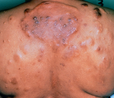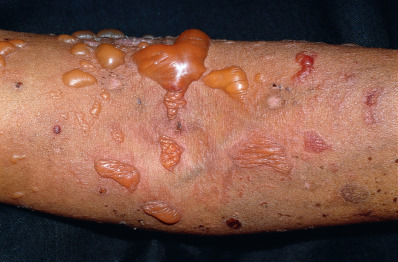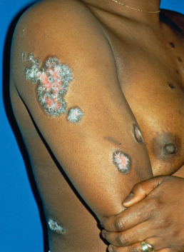 Calcinosis cutis is uncommon but may be dramatic. Also seen infrequently are plaquelike or papulonodular depositions of mucin. These reddish purple to skin-colored lesions are often present on the trunk and arms or head and neck ( Fig. 8.12 ). Last, a symmetric papular eruption of the extremities may occur. These skin-colored to erythematous lesions with a smooth, ulcerated or umbilicated surface may show vasculitis or, in older lesions, a palisaded granulomatous inflammation. These occur in patients with SLE, RA, or other immune complex–mediated disease. This eruption has been referred to as palisaded neutrophilic and granulomatous dermatitis of immune complex disease ( Fig. 8.13 ).