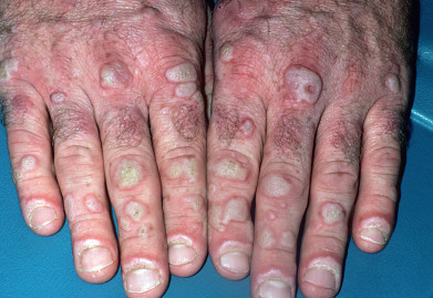 Bullous lesions of lupus erythematosus (BLE) occur as single or grouped vesicles or bullae, often widespread, with a predilection for sun-exposed areas ( Fig. 8.10 ). Rarely, the lesions may itch. Most sets of published criteria require that patients with BLE meet ACR criteria for SLE, but some patients have identical bullous lesions and less than four ACR criteria. Histologically, neutrophils accumulate at the DEJ and within dermal papillae. In bullous lesions, there is a subepidermal bulla or superficial dermal edema containing neutrophils. Fluorescence with IgG, IgM, IgA, or C3 is typically present in a continuous, granular pattern at the BMZ on DIF testing. Neutrophils are found in or below the lamina densa on immunofluorescent electron microscopy. Most of these patients are HLA-DR2 positive. The recognition of this subset as distinct is made clear by its often dramatic therapeutic response to dapsone. Epidermolysis bullosa acquisita is histopathologically and immunopathologically identical, because both diseases are mediated by circulating antibodies against type VII collagen. Dapsone is usually ineffective in epidermolysis bullosa acquisita.