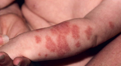 Most infants with neonatal lupus are girls, born to mothers who carry the Ro/SSA antibody. These infants have no skin lesions at birth, but develop them during the first few weeks of life. Annular erythematous macules and plaques may appear on the head and extremities ( Fig. 8.9 ). Periocular involvement (raccoon eyes) may be prominent. With time, the lesions fade and become atrophic. Telangiectasia or dermal mucinosis in an acral papular pattern may be the predominant findings in some cases. Telangiectatic macules or angiomatous papules may be found in sun-protected sites such as the diaper area, may occur independently of active lupus skin lesions, and may be persistent. The skin lesions usually resolve spontaneously by 6 months of age, and usually heal without significant scarring, although atrophy and telangiectatic mats may persist. Dyspigmentation and persistent telangiectasias may remain for months to years. Half the mothers are asymptomatic at delivery, although many will subsequently develop arthralgia, Sjögren syndrome, or other mild systemic findings.