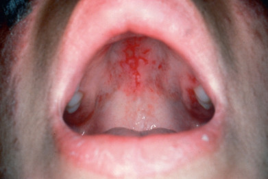 Mucous membrane lesions are seen in 20%–30% of SLE patients. Conjunctivitis, episcleritis, and nasal and vaginal ulcerations may occur. Oral mucosal hemorrhages, erosions, shallow angular ulcerations with surrounding erythema, and gingivitis are common ( Fig. 8.11 ). Erythema, petechiae, and ulcerations may occur on the hard palate.