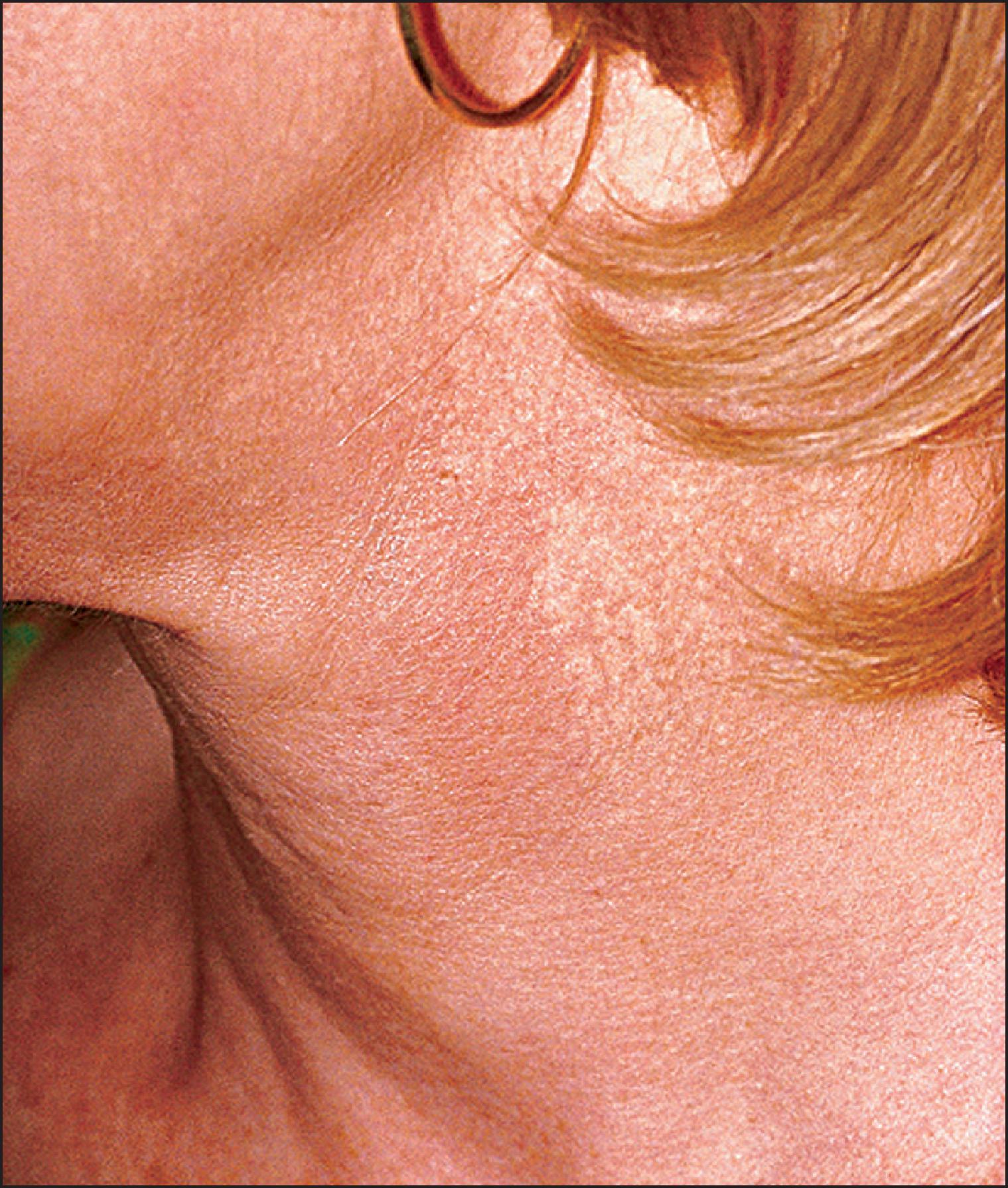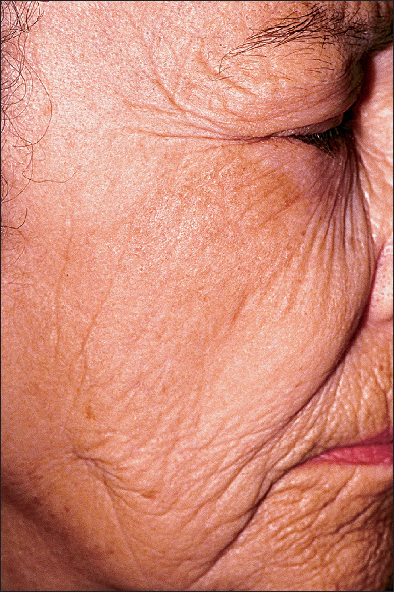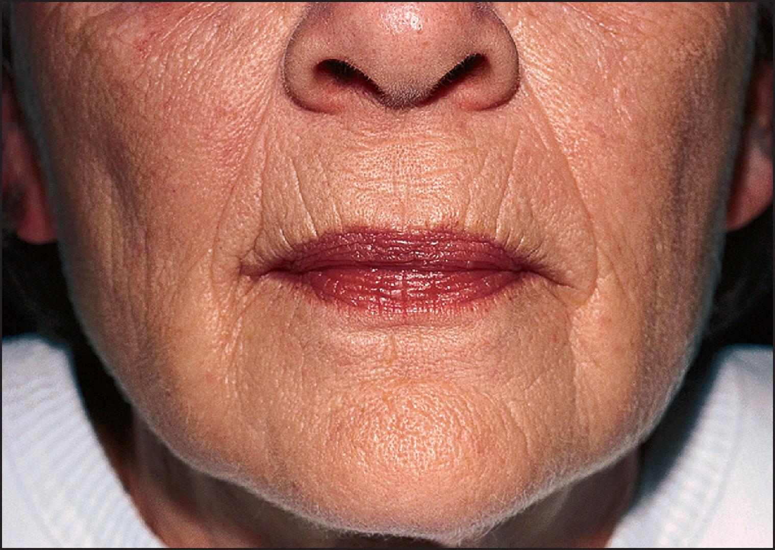 For many consumers, price equates with quality. This may be true for some commercial purchases, but it is not necessarily true for moisturizers. The most expensive parts of any facial moisturizer are the fragrance, the bottle, and the packaging. None of these contributes to the efficacy of the moisturizer, only the aesthetic appeal. A quality moisturizer should contain an occlusive agent, a humectant, and some form of silicone. Ideally, it should also contain a sunscreen to provide the added benefit of sun protection. No moisturizer in any price range will improve the wrinkling on the lower face demonstrated in Fig. 34.1 .