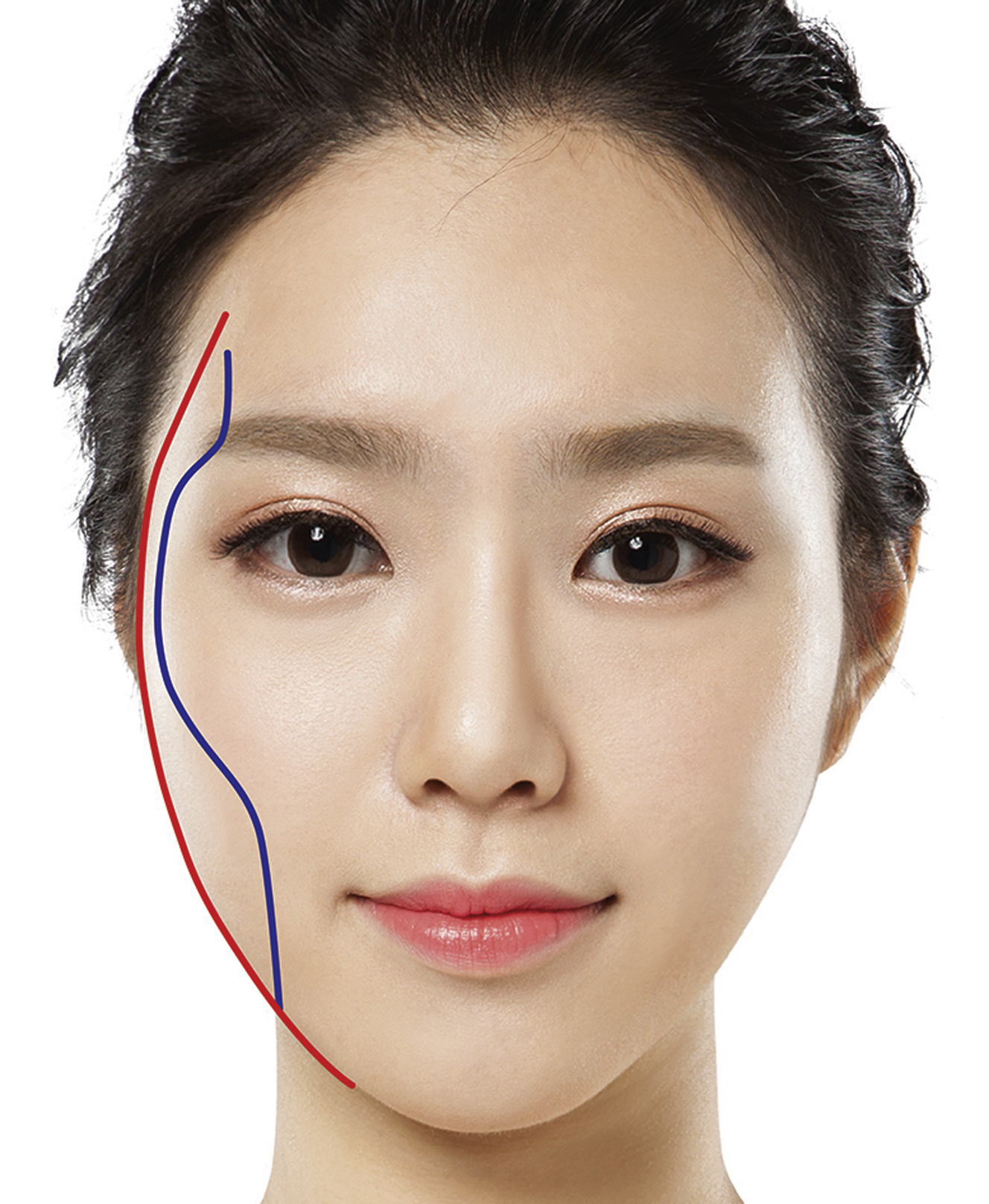 Frontal evaluation can be simplified by visualizing an anterior and posterior facial plane. The anterior facial plane is defined by the superior temporal line, lateral border of the lateral orbital rim, malar prominence, midface, and mentum ( Fig. 2 , blue line). The posterior facial plane is defined by the contour line of the head and zygomatic arch (see Fig. 2 , red line). A combination of variable forms of these 2 planes defines the variety of facial shapes encountered in clinical practice. Anterior and posterior facial lines that are wide and parallel to each other in the midface area lead to a wide facial appearance. Severity of zygoma protrusion is usually determined by bizygomatic distance. In patients in whom the cheek bones protrude outward, the facial line connecting the temple-zygoma-cheek-mandible angle becomes convoluted and gives a harsh look to the face (see Fig. 2 ). In patients in whom the mandible angle flares out, the facial shape forms a square and gives a masculine impression.