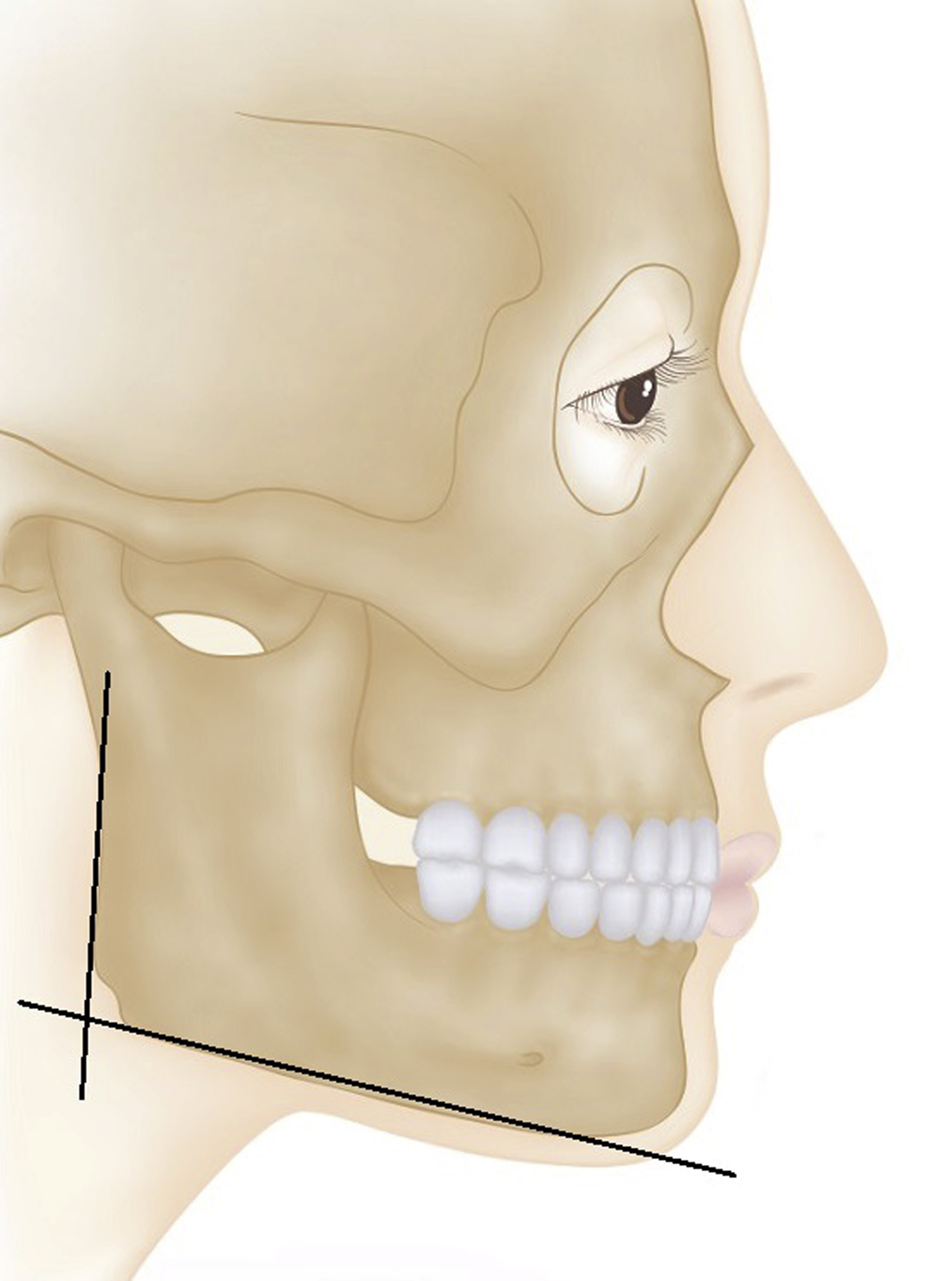 The gonial angle and the mandibular plane should be identified using the lateral cephalogram. If the gonial angle is less than 100°, the facial shape looks square. If the gonial angle is located too low or the mandibular plane is too flat (<30°), the lateral face also looks square ( Fig. 5 ).