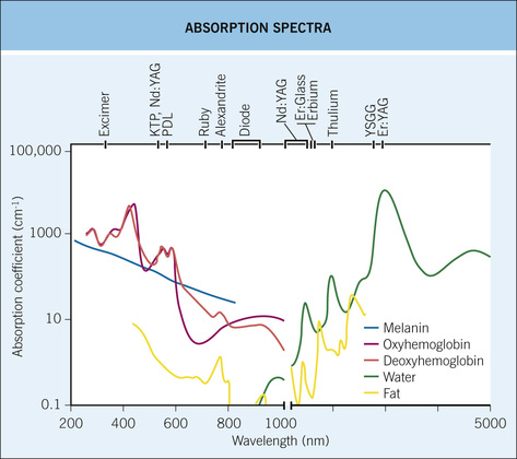 Figure 9-2 Absorption spectra. The heterogeneous absorption spectra of chromophores allow selective photothermolysis to work. Er, erbium; KTP, potassium titanyl phosphate; Nd:YAG, neodymium-doped yttrium aluminum garnet; PDL, pulsed dye laser; YSGG, yttrium scandium gallium garnet. (From Bolognia JL, Jorizzo JL, Rapini RP. Dermatology, 3rd Ed. Elsevier. 2012)