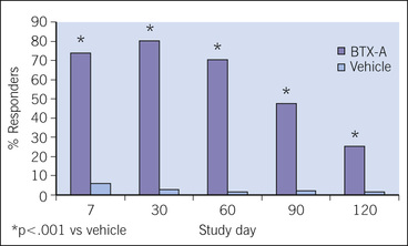 Figure 9-3 Response to BoNT peaked at day 30 and was significantly greater than the placebo (vehicle) at every follow-up visit. (Data from Carruthers JA, Carruthers JDA, Lowe NJ, et al. One year, randomized, multicenter, two period study of the safety and efficacy of repeated treatments with botulinum toxin type A in patients with glabellar lines. J Clin Res 2004;7:1–20)