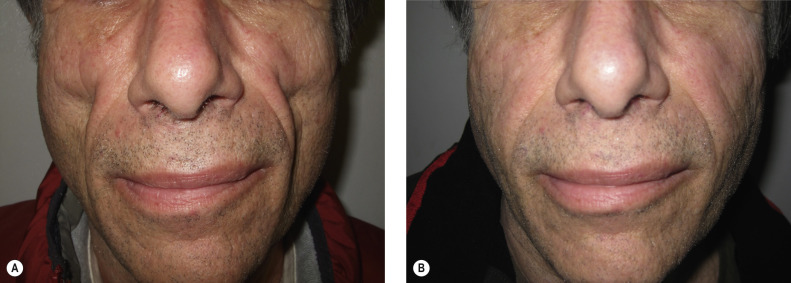 Hyaluronic acid filler, nasolabial fold. (A) Before treatment. (B) Immediately after placement of hyaluronic acid, with marked improvement and reduction of rhytids.