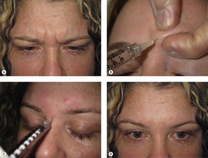 BTX-A is predominantly used in dermatology for treatment of dynamic rhytids on the upper third of the face. The key to successful treatment is understanding the anatomy involved in facial expression, rather than performing the procedure by rote. Having the patient frown, squint, and raise the brows before treatment helps identify the active target muscles and serves as a guide for proper placement.
