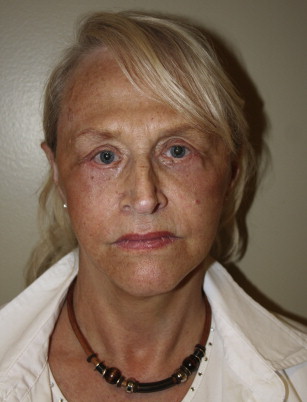 Preoperative photograph, front view of a patient who underwent rhytidectomy along with upper and lower blepharoplasties.