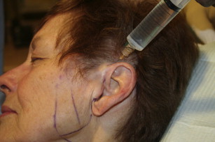 The authors have found it useful to maintain a consistency in all infiltration and all procedures to help eliminate human error ( Fig. 3 ). The authors routinely start on the left side of the face and infiltrate it in a similar fashion, starting from above and behind the left ear, and moving in a sequential fashion anteriorly along the areas of marking where the local anesthetic will end in the subcutaneous plane ( Fig. 4 ). It is helpful to first infiltrate the area of the infraorbital nerve and the great auricular nerve, as this may decrease the sensation of the needle around the ear ( Fig. 5 ).