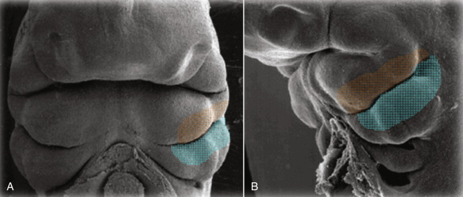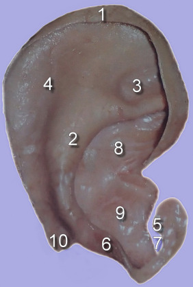 The external ear appears only in mammals. The internal, middle, and external ear development is a beautiful and complex embryologic orchestration. The classic description by His is as follows. The external ear forms from tissues of the first and second pharyngeal arches, which can be seen at 5 weeks ( Fig. 8.1 ). Six tissue elevations termed auricular hillocks of His become apparent at 6 weeks in utero ( Fig. 8.2 ). Three hillocks form from the first arch and three from the second arch. Each of the auricular hillocks forms a distinctive portion of the definitive external ear. For example, hillock 1 forms the tragus and hillock 6 forms the antitragus, as well as part of the helix ( Fig. 8.3 ). The lobule of the ear is not derived from the hillocks. The developing external ears are initially more caudal than the lower jaw. Growth of the lower jaw places the external ear in a relatively higher and more vertical orientation.