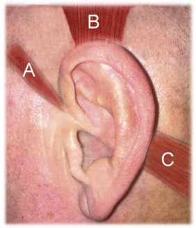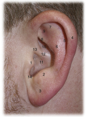 The developed external ear has evolved to capture and focus vibrations through the middle ear canal to the inner ear. In humans, many of the functions remain vestigial. Anyone who has ever witnessed animals whose life depends on detecting predators in nature, such as deer, has a better understanding of the complex movements and function of the mammalian external ear. Fig. 8.4 shows the normal anatomic components of the developed ear.