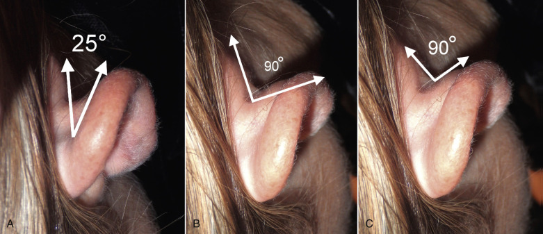 Classic otoplasty texts discuss complex angles of where the various components of the ear are in relation to other structures. These include the conchomastoid angle, conchocephalic angle, and auriculocephalic angle (also called the “cephaloauricular angle”) ( Fig. 8.7 ). These are often described differently in various texts and although they are important for the understanding of normal and abnormal ear posture, they are rarely used in treatment planning. I liken this to a facelift surgeon realizing a normal cervicomental angle is 90–110 degrees but not using this measurement in any way when performing facelift surgery. I rely much more on actual millimeter measurements than angles for otoplasty planning and surgery.