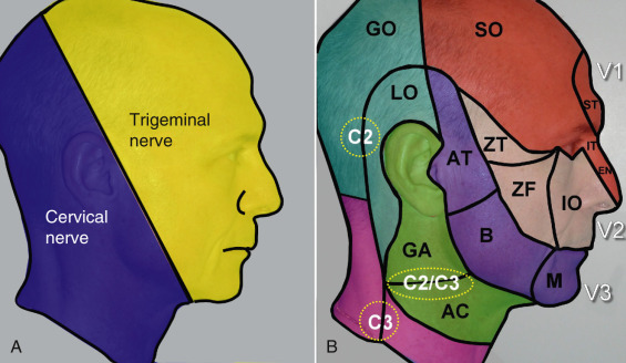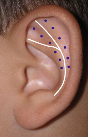 The auriculotemporal nerve is a branch of the mandibular division of the trigeminal nerve and supplies sensation to the tragus and helical crus. The anterior branch of the greater auricular nerve (from the cervical plexus) innervates most of the ear, including the helix, scapha, antihelix, concha, antitragus, external acoustic meatus, and lobule. The posterior branch of the greater auricular nerve also innervates some of the posterior ear. The mastoid branch of the lesser occipital nerve (from the cervical plexus) also innervates the posterior region of the external ear ( Figs. 8.8 , 8.9 ). The external auditory meatus also receives innervations from branches of the vagus (Arnold’s nerve) and glossopharyngeal nerves. The entire ear can be anesthetized by injecting local anesthesia along the base anteriorly and posteriorly. Supplemental anesthesia may be needed at the posterior wall of the external auditory canal supplied by the auricular branches of the vagus nerve (Arnold’s nerve). For other supplemental local anesthesia, a “ring block” is performed by injecting circumferentially around the ear ( Fig. 8.10 ).
