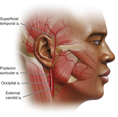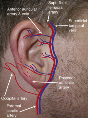 The anterior arterial blood supply to the ear is primarily derived from the external carotid artery via the superficial temporal branch. The superficial temporal vessel exits the parotid capsule and passes under the anterior auricular muscle and divides into superior, medial, and inferior branches to supply the anterior surfaces of the auricle. The posterior auricular artery branches from the external carotid artery and runs parallel to the posterior auricular crease, deep to the posterior auricular muscle and greater auricular nerve. The posterior auricular artery (a branch of the external carotid) supplies the posterior surface of the ear and also has superior, medial, and inferior branches. The posterior ear also has arterial contribution from the mastoid branch of the occipital artery (a branch from the external carotid) ( Figs. 8.11 , 8.12 ).