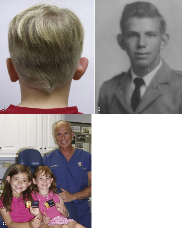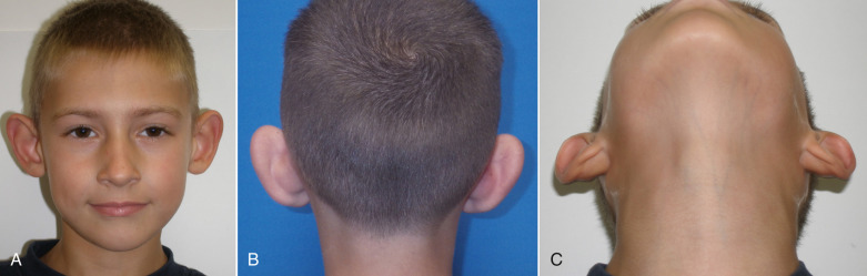 Prominauris is the condition of protruding ears. Growth disturbances of the auricle have been described to occur in 1 in 12,500 births or 5% of the population. The ear grows proportionally at a rapid rate, and 85% of ear development is complete by age 3. The ear is fully developed at 7–8 years of age. The fact that a small percentage of protruding ears are present at birth but a larger percentage seen at 1 year indicates that many cases of protruding ears are acquired deformities. The only difference between the neonatal ear and the adult ear is that, in the neonate, the cartilage is more malleable and soft. Otherwise, the anatomy is the same. Ear width reaches its mature size in boys at 7 years and in girls at 6 years. Ear length matures in girls at 12 and boys at 13 years of age. Ear cartilage becomes stiffer and calcified with age. Heredity plays an obvious part in the birth and development of protruding ears and is an autosomal dominant trait ( Fig. 8.15 ).