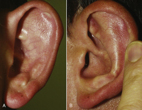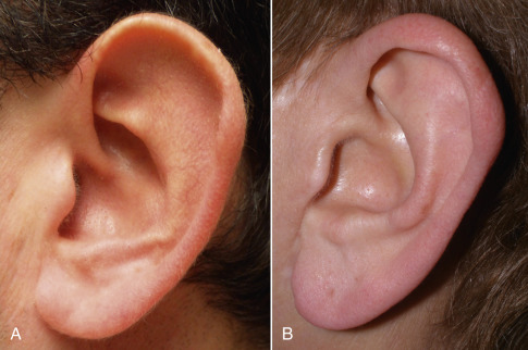 The antihelix includes the superior and anterior crus and forms a curvilinear separation between the conchal bowl and the scapha. The region between the crus is called the “fossa triangularis.” In developmental ear deformities, the antihelical fold is often ill-defined or absent ( Fig. 8.16 ). This deformity can be bilateral or unilateral.