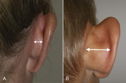 The average length of a male auricle is 63.5 mm and the female 59 mm; the average width of the male auricle is 35.5 mm and the female is 32.5 mm. The helix should project 2–3 mm more laterally than the antihelix on the upper third of the ear on frontal view ( Fig. 8.5 ).