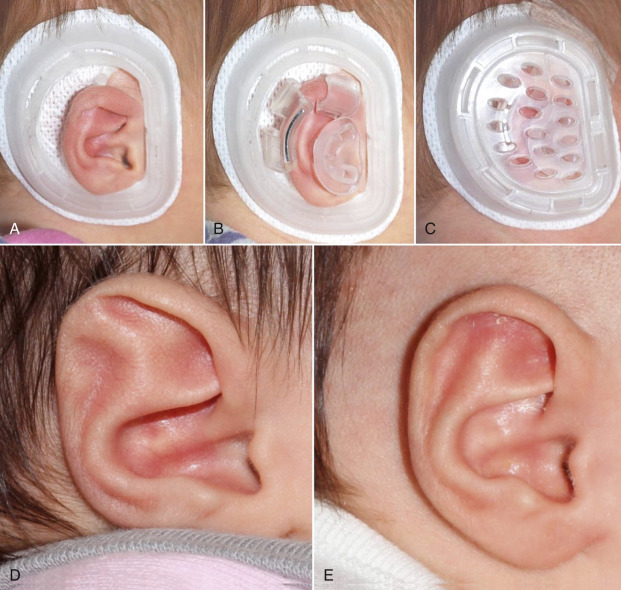 Placement of the device is straightforward for the experienced surgeon ( Fig. 8.20 ). After the diagnosis has been confirmed by physical examination, a thin strip of hair (1–2 cm wide) is shaved with the electric clippers supplied with the treatment kit. The skin is prepped with alcohol, and the self-adhesive cradle is applied to the child’s skin surrounding the ear. Helical rim and conchal formers are then placed within the cradle to correct the specific anatomic deformities present, and the perforated anterior shell is attached to the posterior cradle. This applies anterior forces to the retractors while allowing visual inspection of the child’s ear. Time from preparation to application is <5 min. The adhesive on the posterior cradle usually lasts for approximately 2 weeks, at which point the device is removed, the ear inspected, and a new device reapplied. A typical treatment course averages 6 weeks. However, if treatment can be initiated within the first week of life, treatment time can be shortened to 2 weeks with 95% efficacy.