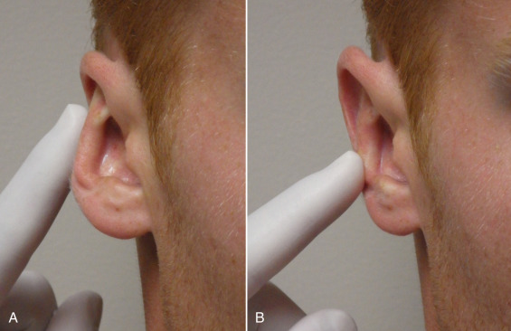 It may be confusing for novice surgeons to decide the appropriate procedure to set back the ear. In a patient with a simple lack of antihelical fold with a normal conchal bowl, pushing the pinna posterior as shown in Fig. 8.23 improves the deformity. If the patient has conchal bowl hypertrophy, pushing the upper ear distorts the pinna and does not move the ear as a whole. Pushing on the middle of the ear, however, produces a more natural result. This is due to the fact that pushing on the middle of the ear buckles the hypertrophic conchal bowl (in a similar manner that cartilage reduction) and sets the entire ear posterior. This maneuver means that this patient would not be a candidate for Mustardé otoplasty but rather needs cartilage reduction of the conchal bowl. In many cases, the patient may need both procedures. Patients with a normal antihelical fold but protruding ears, may only need conchal bowl reduction and not a Mustardé procedure.