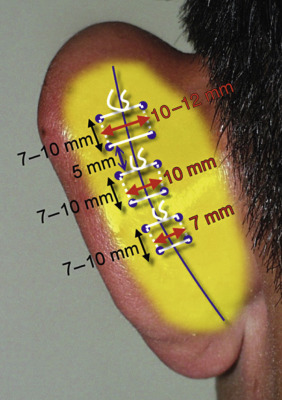 Although experienced surgeons can place Mustardé sutures with little or no markings, a well-planned template can greatly assist the novice surgeon. The top mattress suture is placed superiorly to extend the new fold close to the helical rim. The middle suture assists in creating the main curvature of the fold and the bottom suture assists in creating the secondary inferior portion of the AHF. The horizontal leg of the sutures is generally placed 10–12 mm across at the superior portion of the ear, approximately 10 mm across at the middle of the ear, and approximately 7 mm across at the inferior portion of the ear. Since the natural AHF tapers from top to bottom, the width of the sutures also decreases. The vertical leg of all of the sutures is the same for all sutures, approximately 7–10 mm. Each mattress suture is placed about 5 mm from the previous suture ( Fig. 8.26 ). These measurements are not absolute and vary from patient to patient and the specific deformity but these measurements serve as a basic approach. If a conchal bowl reduction is anticipated, these markings can be made at this time and are covered later in this chapter.