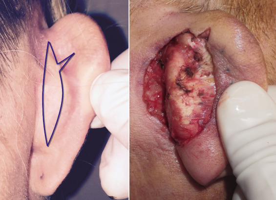 The delicate and complex ear cartilage is one of the most unique anatomic forms in the body. The entire external ear possesses a cartilaginous framework, with the exception of the lobe and the tragal incisura ( Fig. 8.14 ).