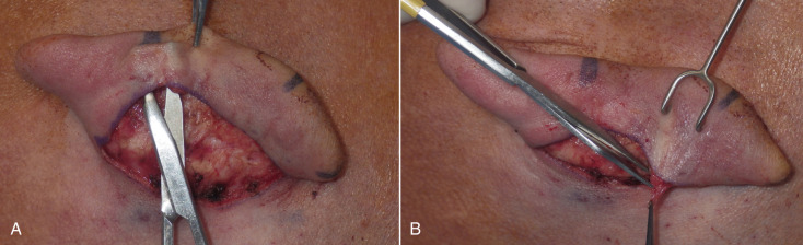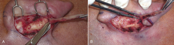If a conchal bowl reduction (Davis procedure) is to be performed, significant postauricular soft tissue dissection needs to be performed but when doing a pure Mustardé procedure, this is not necessary. After the excision of the skin ellipse to the level of the perichondrium, the remainder of the soft tissue is undermined to expose the posterior pinna. Again, staying in the subperichondrial plane facilitates the dissection. I prefer small blunt scissors such as tenotomy scissors. The dissection is carried to or just short of the helical rim to allow sufficient access. Clipping and spreading the scissors easily dissects this plane ( Fig. 8.30A ). One pearl on this dissection is to remove excess soft tissue that is present under the superior incision margin ( Fig. 8.30B ). If left in place, this soft tissue can become entangled with the Mustardé sutures, entrapped in the knot. Removing the excess soft tissue at this phase makes things easier later. Dissection continues until the entire posterior pinna is exposed in the subperichondrial plane ( Fig. 8.31 ).