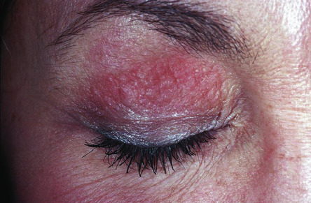 In one series, the North American Contact Dermatitis Group determined that 12% of cosmetic reactions occurred on the eyelid, but only 4% could be linked to eye make-up use . When allergic contact dermatitis is due to eye shadows, the most common culprits are the red pigments used in pinkish eye shadows. Unfortunately, it can be difficult to determine the etiology of allergic contact eyelid dermatitis with routine patch testing , since many substances can be transferred to the eye area by the hands, complicating the dermatologic evaluation . However, eye shadows are a rare cause of eye infections, since the dry powder cake does not support bacterial growth.