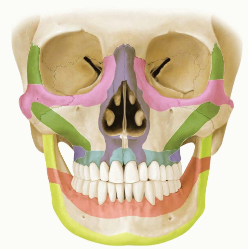 FIG 2 • The craniofacial buttresses (shown in color) are areas of increased bony strength in the facial skeleton, which are the safest locations for implant placement.