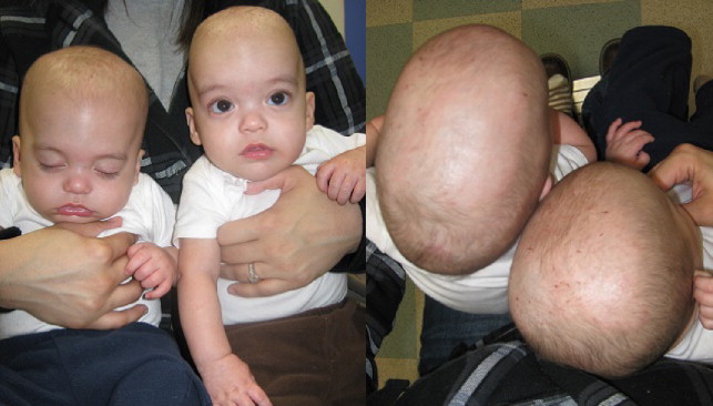 Four-month-old identical twins, frontal and vertex views. Twin on left lap with sagittal synostosis and scaphocephaly.