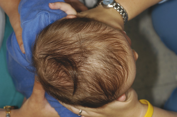 The reasons why some infants are able to change their head position (and avoid flattening) while others are not is worth discussion. Numerous risk factors have been linked to the development of deformational flattening, including supine sleep position, multiple births, developmental delay, small maternal pelvis, breech position, oligohydramnios, male gender, gestational diabetes, nulliparity of mother, high birth weight, large neonatal head size, vaginal delivery, prolonged length of postdelivery hospital stay (>4 days), and prolonged duration of stage II labor. Although these variables seem unrelated, they share a common pathogenic link to the development of deformational cranial flattening: each directly or indirectly impairs infant head mobility early in life. For example, most of the risk factors described earlier are also associated with the development of CMT, the most common risk factor for deformational flattening. Congenital muscular torticollis is not always easy to detect in a newborn, but the presence of a “preferred” head position early in life is highly suggestive. Infants with CMT have restricted motion in one direction and excessive head rotation in the other. This is an imbalance of the sternocleidomastoid muscles from in utero positioning—one contracted and the other stretched and atrophied. The characteristic head position is tilted to one side (toward the side of the tight muscle) and rotated to the other (toward weaker muscle). In most infants, increased motor development allows gradual resolution of CMT. The timing of improvement can vary based on the severity of the contracture or imbalance and the neuromuscular development of the infants. Once the infant can move his or her head, usually at 4 months of age, further flattening is unlikely.