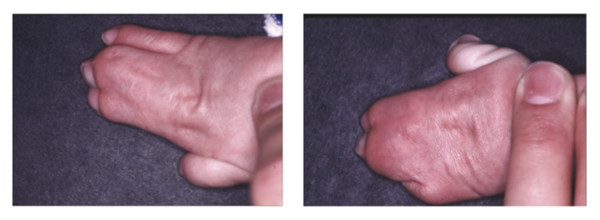 Clinically, classic diagnostic findings for Saethre–Chotzen syndrome include unilateral or bilateral coronal craniosynostosis, strabismus, ptosis, low frontal hairline, and malformed ears, each with a distinctly small pinna and prominent superior crus. In contrast to Apert’s syndrome, patients with Saethre–Chotzen syndrome neither have syndactyly features of the hands and feet nor have the proptosis feature characteristic of Crouzon’s syndrome. Patients with Saethre–Chotzen syndrome are clinically differentiated by their low-set frontal hairline, parrot-beaked nose, brachydactyly, and milder bone deformities. In addition, patients may have partial syndactyly of the fingers, usually between the web space of the index finger and long finger.