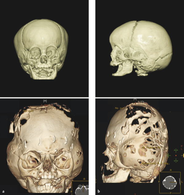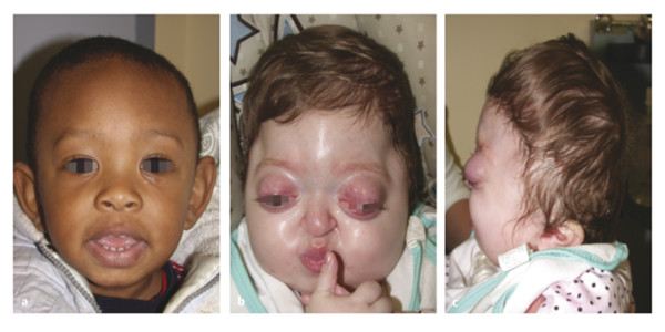 Craniofacial syndromes can be divided into two broad categories: craniosynostosis-associated syndromes and cleft-associated syndromes. The clinical diagnosis and surgical management of craniofacial syndromes, such as Apert’s, Crouzon’s, Muenke’s, Pfeiffer’s, Saethre–Chotzen, and Treacher Collins syndromes, are complex due to the overlapping and varied phenotypic presentations and genetic mutations of the different syndromes. For example, all craniosynostosis syndromes have abnormal, premature fusion of one or more cranial sutures. However, some syndromes, such as Apert’s and Pfeiffer’s syndromes, have prominent midface extrusion, whereas the midface position is less severely affected in other conditions, such as Muenke’s and Saethre–Chotzen syndromes. Thus, correct diagnosis and treatment for these conditions require a multidisciplinary team approach. Surgical and nonsurgical management needs to be tailored based not only on the genetic and clinical diagnosis but also on the severity of symptoms and functional compromise experienced by the patient. Optimal treatment quite often necessitates multiple surgical disciplines, with the involvement of a pediatric plastic surgeon being essential for a successful outcome.
