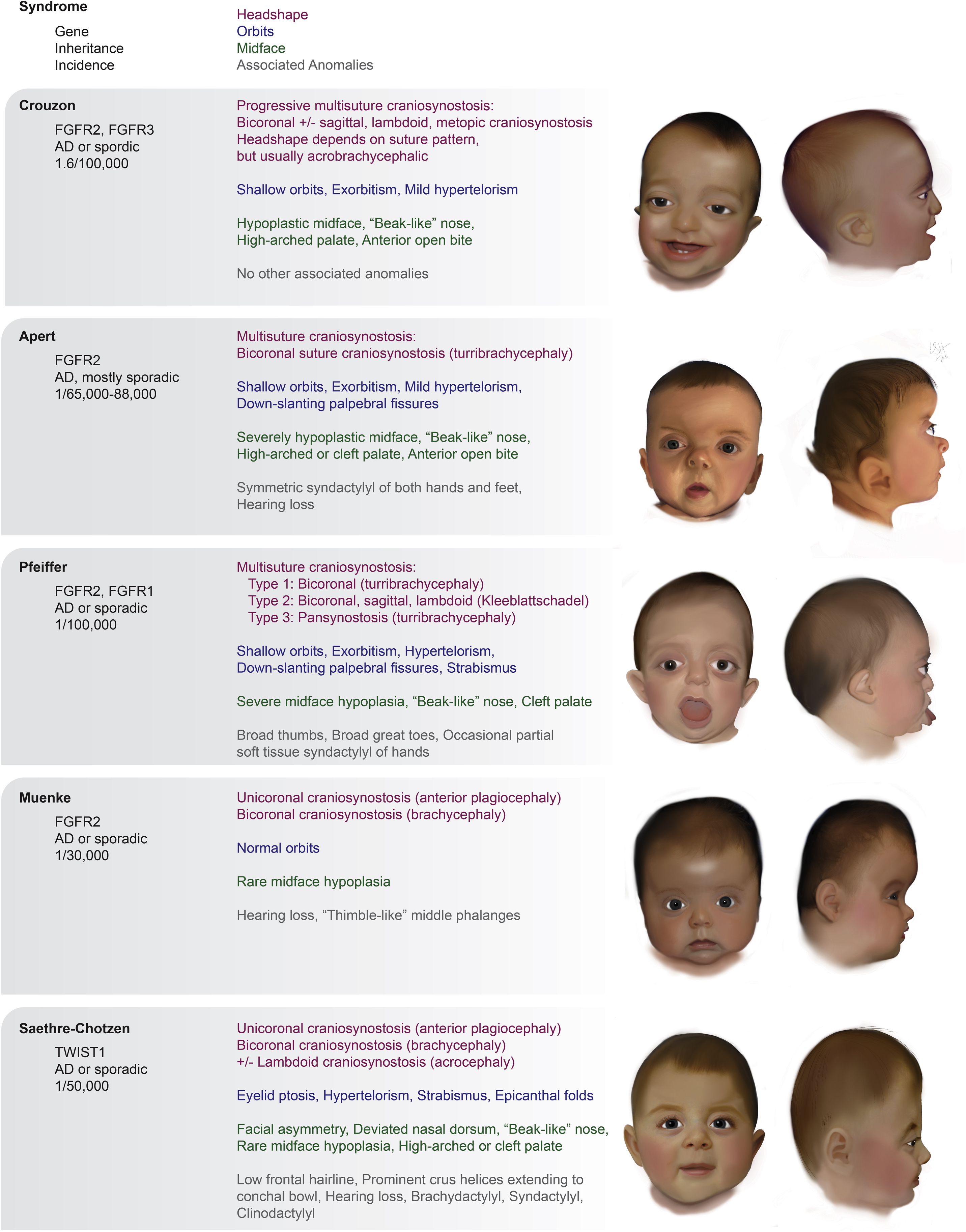Patients with CS may or may not be associated with a known syndrome, of which the most common are Crouzon, Apert, Pfeiffer, Sathre Chotzen, and Muenke syndromes ( Fig. 1 ). Patients with syndromic craniosynostoses have high rates of multisuture CS manifesting in turribrachycephaly, elevated ICP, hydrocephalus and/or cerebral tonsillar herniation (ie, Chiari malformation). , These syndromes have genetic underpinnings, namely involving mutations of the FGFR1, FGFR2, FGFR3, and TWIST 1 genes, with autosomal-dominant inheritance patterns (see Fig. 1 ).