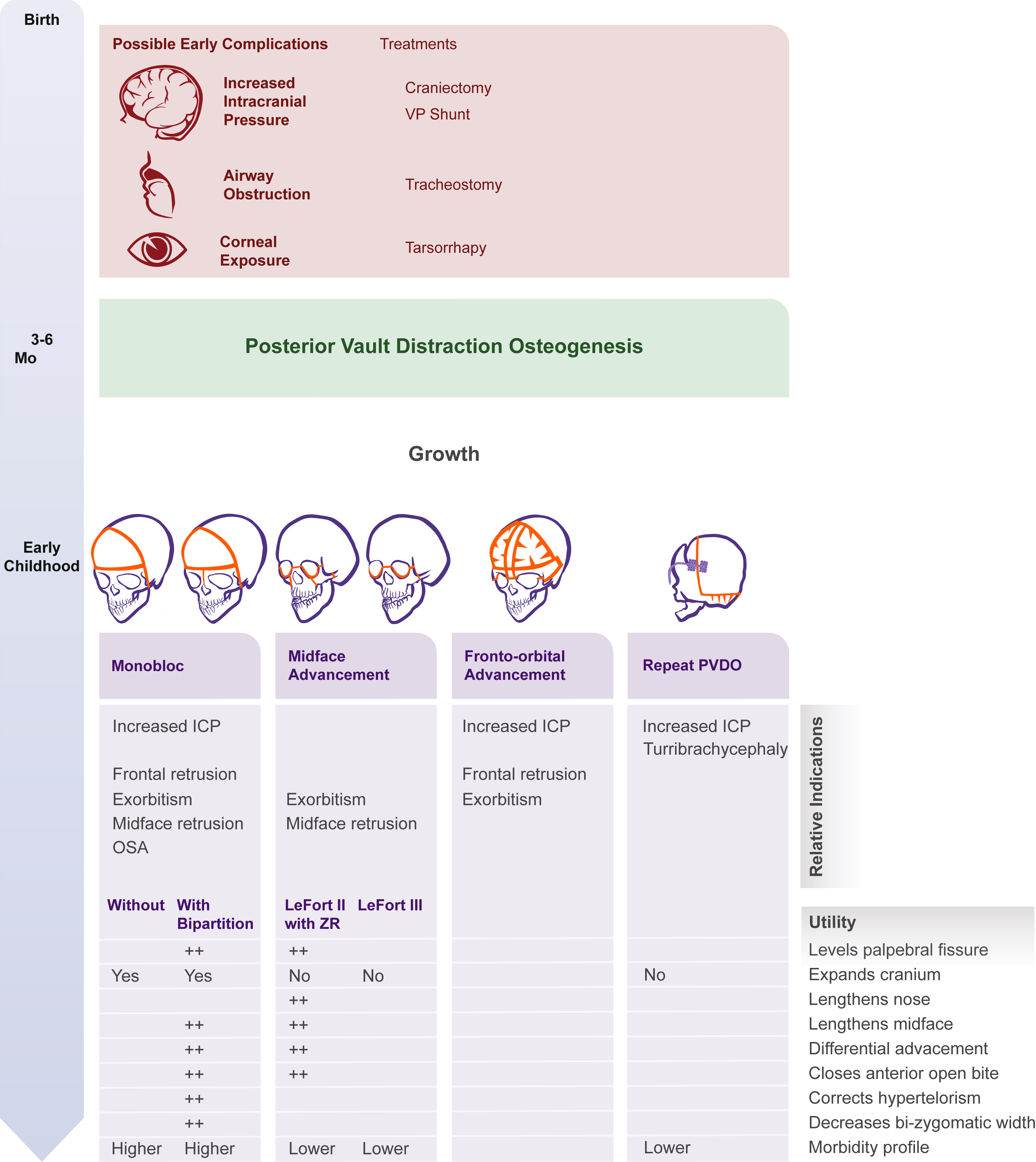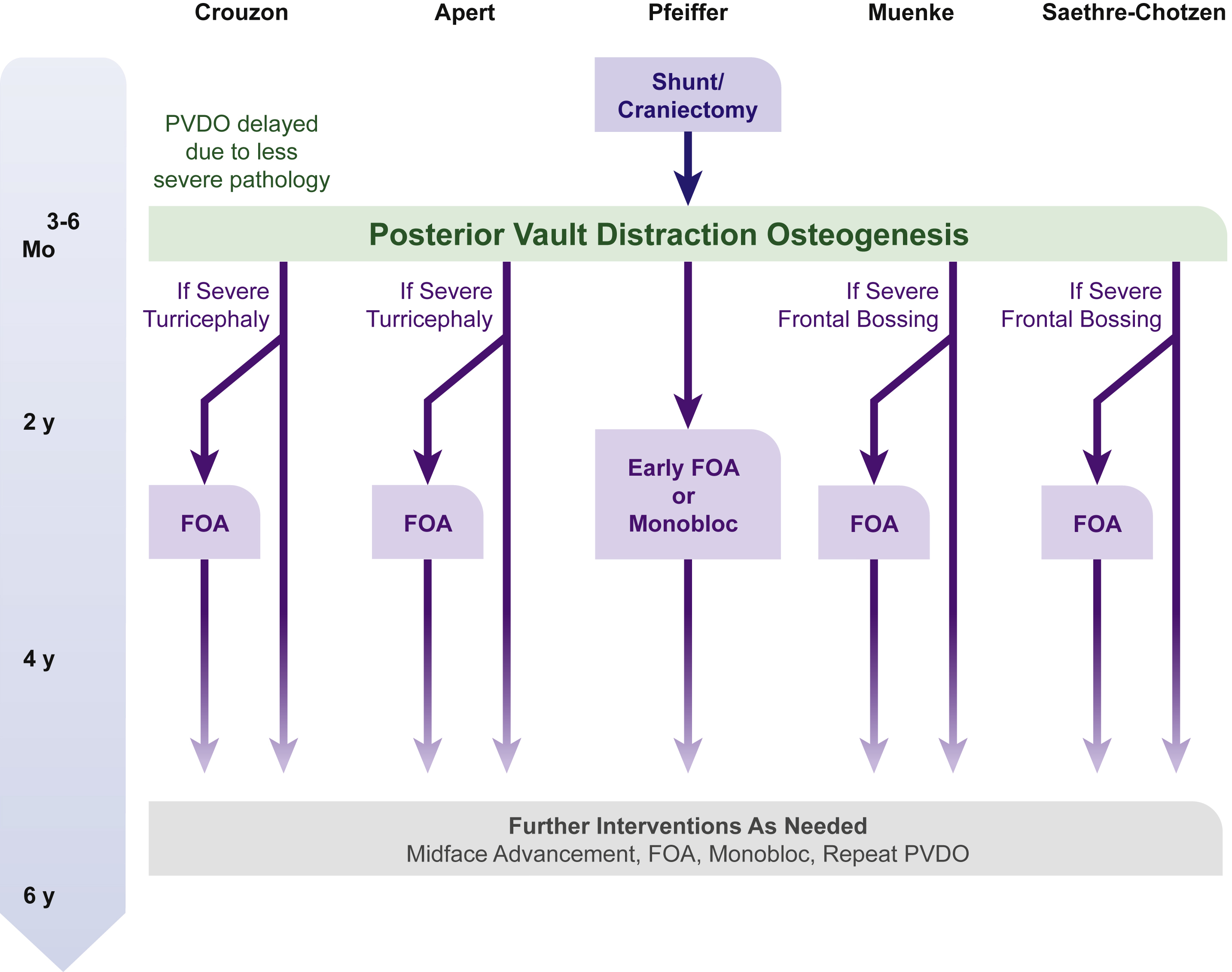 We anticipate that the progression of related deformities may need additional surgical treatment and are guided by a philosophy of optimizing function and minimizing the number of surgical procedures when planning additional interventions. Deformities may involve different anatomic levels alone or in combination: intracranial pathology (recurrent or persistently elevated ICP), cranial dysmorphology (frontal bone retrusion, turribrachycephaly), orbit (exorbitism, hypertelorism), nasal length (short), midface hypoplasia (central vs lateral), orthodontic or dental (abnormal maxillary dental arc, anterior open bite, high-arched palate), and obstructive sleep apnea. Patients may require a midface-only versus cranial vault-only expansion or both. The procedures may occur simultaneously (ie, monobloc) or in a staged fashion (see Fig. 2 ). , Following this treatment algorithm, we identified common syndrome-specific management patterns for interventions after PVDO as an initial intervention ( Fig. 3 ). Similar approaches have been supported by a number of studies, with the emphasis on early cranial expansion within the first year of life to optimize cognitive outcomes.