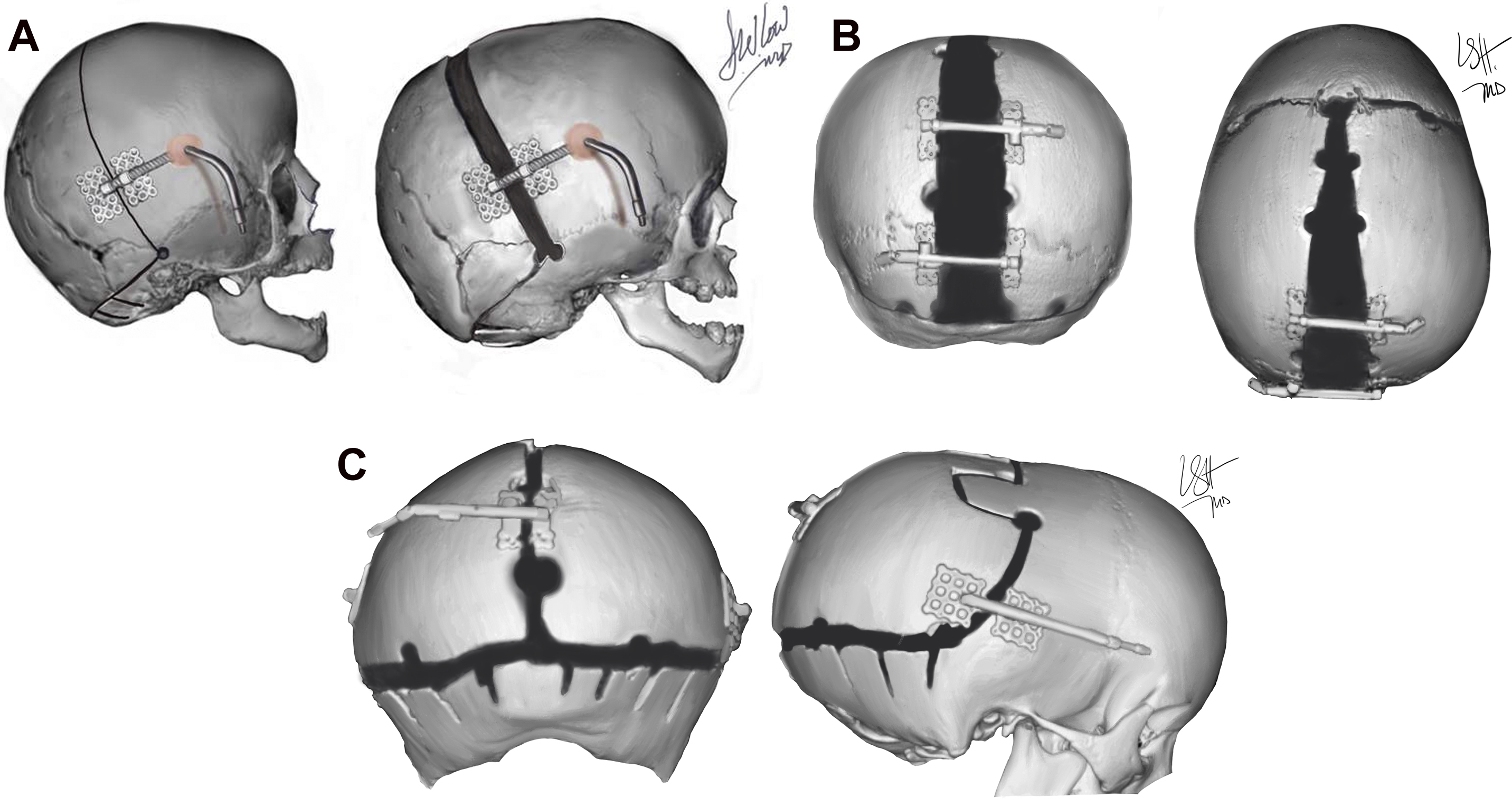 Lambdoid suture plating: Open lambdoid sutures may be rigidly fixated with resorbable plates and screws to prevent excursion across the open suture. This maneuver allows for the parietal and occipital bones to transport in concert, although plating the lambdoid sutures may have deleterious effects on occipital growth.