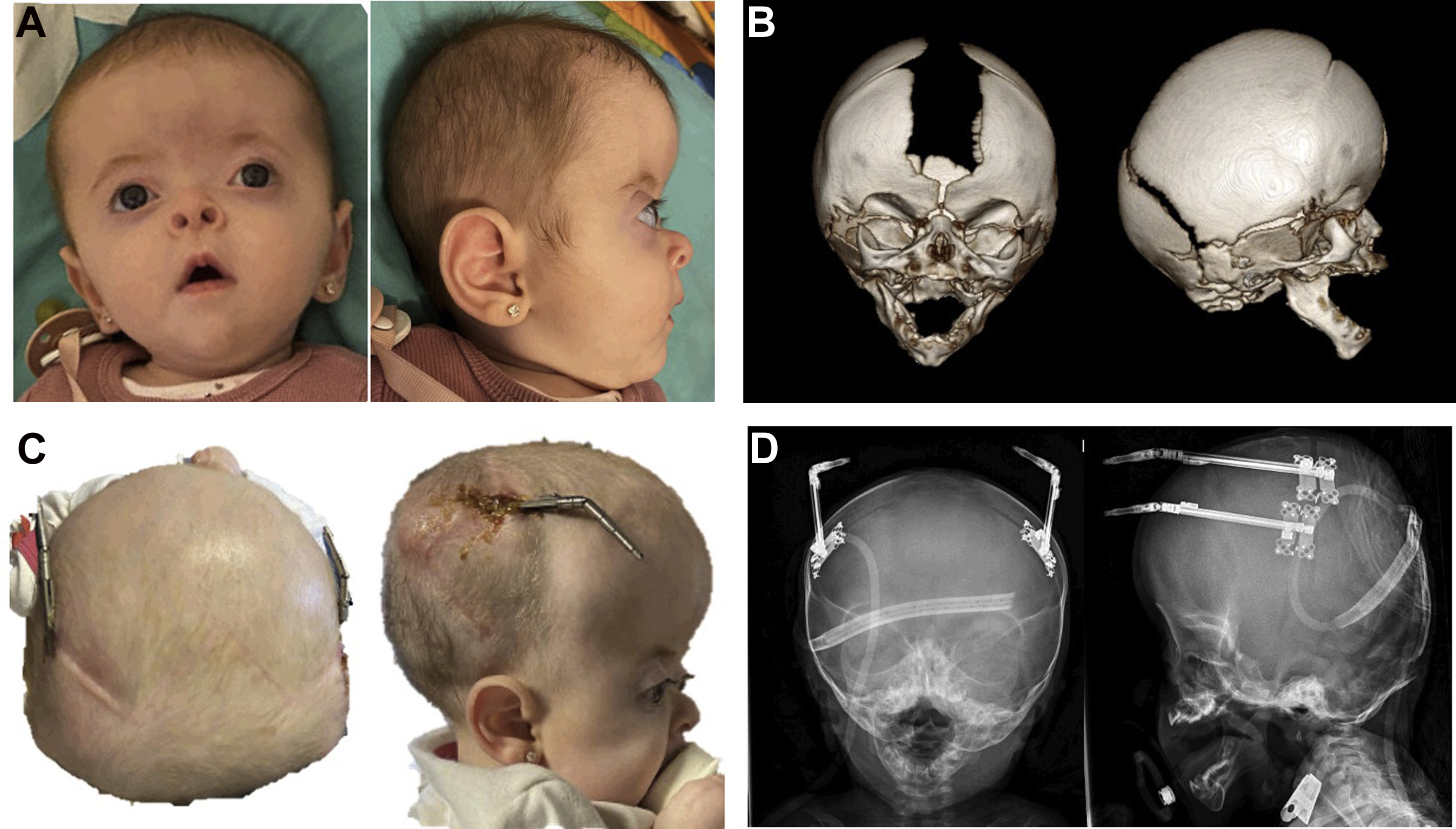 A 6-month old baby girl with Apert syndrome and bicoronal CS who underwent PVDO in a posterior-inferior vector to achieve intracranial expansion and address her turribrachycephaly ( Fig. 5 ). The total distraction distance was 35 mm. Before PVDO, she had a gastrostomy tube placed to assist with nutrition and nasal dilation for choanal stenosis.