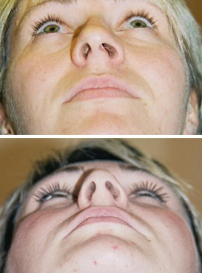 Intranasal visualization is essential to understand the problem. A palpating thumb can push back the nasal tip to expose the lower septum, and a speculum allows direct viewing of the deep septum. Ideally, a nasoendoscope is available. This allows for full determination of nasal septal deformities and nasal valve function. Palpation of the external nasal pyramid produces further information, such as the presence of one vertical nasal bone or one oblique bone. The resilience and support of the tip cartridges can easily be ascertained. Finally, it is important to walk around the back of the patient with her or his head tilted backward to make a final assessment of the axis of the nose.