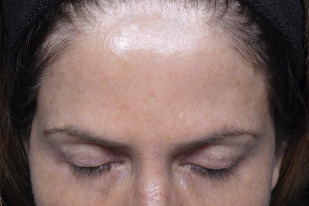 There were 2 instances where a community practitioner contacted one of the authors regarding vascular necrosis in the temporal area. In both cases, the filler was reportedly injected into deep tissues. In both cases, the cardinal signs included transient blanching of the lateral forehead progressing to a reticular pattern, significant pain that was delayed in onset and intensified after several hours of injection, and the appearance of vesicles that were interpreted as an herpetic outbreak. These patients went on to develop necrosis of the superficial dermis with scarring. Both practitioners reported massaging the area once they saw the blanching until the skin turned pink. In the first author’s opinion, once a large bolus of the product is infused intraarterially and massaged, it is forced to move distally into the end arterioles. Depending on the particle size, lodging at the corresponding vessel diameter could explain the immediate transient revascularization, followed by the reticular pattern of blanched and purplish skin.