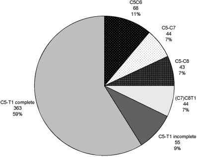 The root contribution to each upper extremity muscle is variable. In addition, a prefixed or postfixed brachial plexus can further confound clinical expression of a root lesion. Following a stretch injury, each nerve fiber in the root, trunk, or peripheral nerve sustains a unique histologic lesion (ie, Sunderland 1–5) such that one portion of a root may recover spontaneously and another portion may not. These factors contribute to significant variability in the expression of motor or sensory deficits following a root lesion(s). Each clinical case is unique and a detailed clinical examination is always required. Clinicians broadly group brachial plexus lesions into upper (C5C6) or lower (C8T1) plexus lesions with or without involvement of C7 ( Table 1 ).