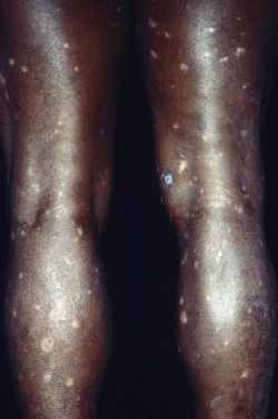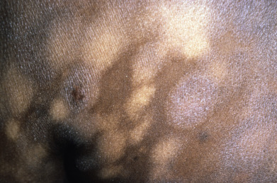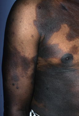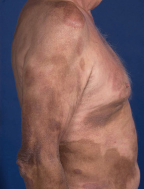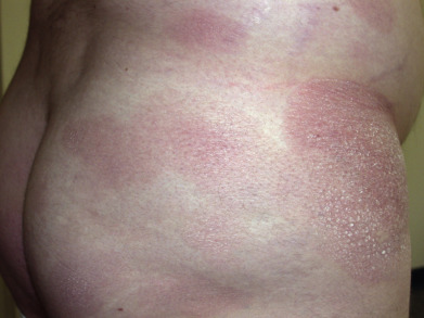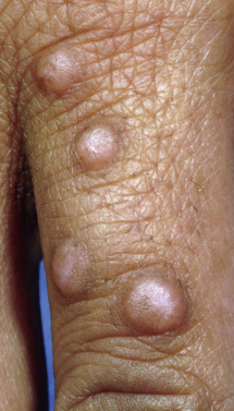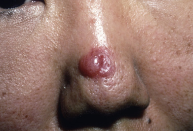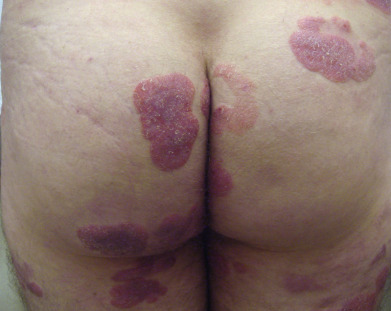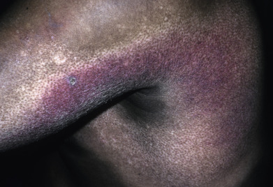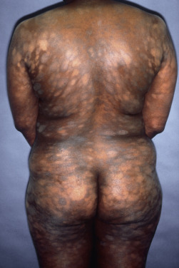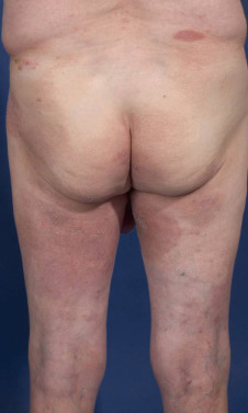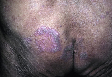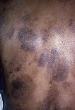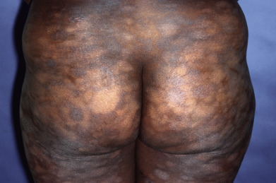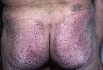 Mycosis fungoides commonly involve the trunk, buttocks, and proximal extremities. The lesions tend to be larger than 5 cm in diameter with a poikilodermatous appearance (mottled, hyperpigmentation and hypopigmentation, atrophy, and telangiectasia). B-cell lymphomas commonly present as plum-colored nodules with a smooth, shiny surface. Discrete nodules on the head and neck, trunk, or proximal extremities; arcuate lesions and nodules on the trunk; taught, shiny nodules on the lower extremities; and multinodular lesions on the legs are all seen in the wide variety of lymphoid neoplasms in this chapter. The lesions of lymphomatoid papulosis are often papulonecrotic, erupt in crops, and resolve spontaneously. Leukemias and myelomas often appear as skin-colored to purple papules and nodules, at times with accompanying hemorrhage into the lesions. This portion of the atlas will focus on the cutaneous manifestations of lymphoid proliferations.