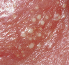 Pustules are small elevations of the skin containing purulent material, usually necrotic inflammatory cells ( Fig. 2.6 ). They are similar to vesicles in shape and usually have an inflammatory areola. Pustules are usually white or yellow centrally but have a red tinge if they also contain blood. They may originate as pustules or may develop from papules or vesicles, passing through transitory early stages, during which they are known as papulopustules or vesicopustules.