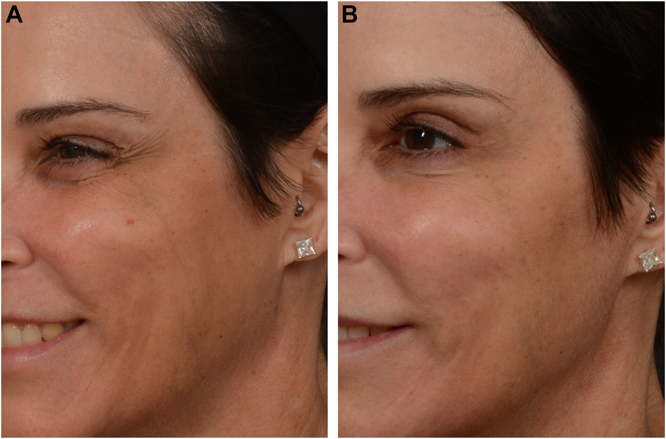 Anecdotally, Daxi-BoNTA seems to exhibit superior diffusion similar to that of Abo-BoNTA. This is attributed to RTP004’s ability to improve the binding and retention of Daxi-BoNTA at nerve terminals, facilitating its passive movement along the treated muscle and wider extension of clinical effect [ ]. Optimal diffusion contributes to the more even “field effect” clinically described, likely most beneficial when treating broad muscles such as the frontalis or orbicularis oculi [ ]. For example, optimal diffusion along the entire orbicularis oculi may explain the reduction in recruitment of compensatory medial muscle movements following Daxi-BoNTA treatment of lateral canthal lines (LCL; Fig. 1 A and B ). Superior diffusion may also contribute to the reduced need for “touch-ups” observed with Daxi-BoNTA.