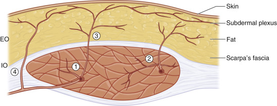 Secondary arterial inputs to the lower abdominal flap come from the SEA, lower intercostal arteries, superficial and deep circumflex iliac arteries, and superficial external pudendal artery. Since the DIEAP and SIEA flaps are elevated as skin islands isolated on their respective dominant pedicle, the minor contributors are ligated during harvesting of the flap. If indicated, however, a minor pedicle can be dissected and anastomosed in addition to the dominant pedicle to extend the territory of the flap.