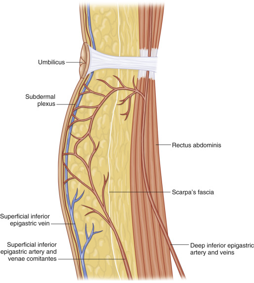 The superficial inferior epigastric artery (SIEA) is the second important blood supply provider to the lower abdominal skin. The SIEA is a direct cutaneous vessel, originating from the common femoral artery 2–3 cm below the inguinal ligament in 17% of cases or from a common trunk with the superficial circumflex iliac artery in 48% of patients. The artery is absent or hypoplastic in 35% of specimens, in which case it is often substituted by a large ascending branch from the superficial circumflex iliac artery. The SIEA courses in the subcutaneous fat towards the umbilicus where it often anastomoses with large periumbilical perforating arteries.