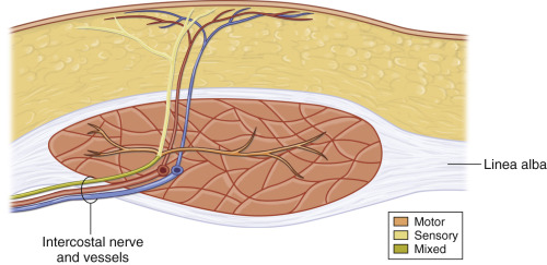 The motor and sensory innervation to the abdominal wall is provided mainly by the intercostal nerves 7–12 with some contribution from the iliohypogastric and ilio-inguinal nerves. As shown in Table 57.1 , the lateral muscles are supplied by all eight nerves, whereas the more medial rectus abdominis and pyramidalis are innervated solely by the intercostals. The sensory innervation to the abdominal skin is derived from the lateral and anterior cutaneous branches of the intercostal nerves giving rise to segmental dermatomes. A small skin area immediately superior to the pubis is supplied by the anterior cutaneous branch of the iliohypogastric nerve.